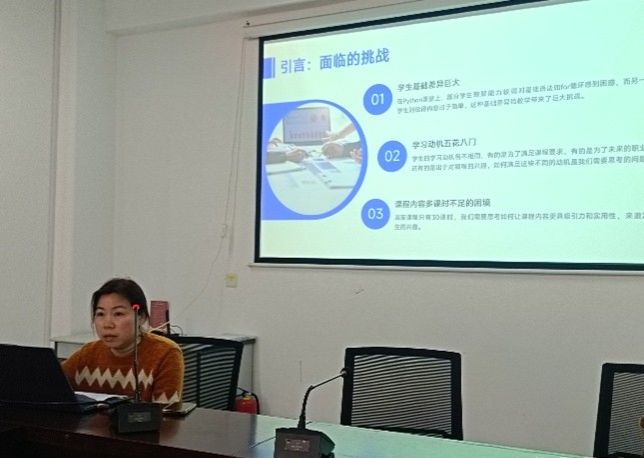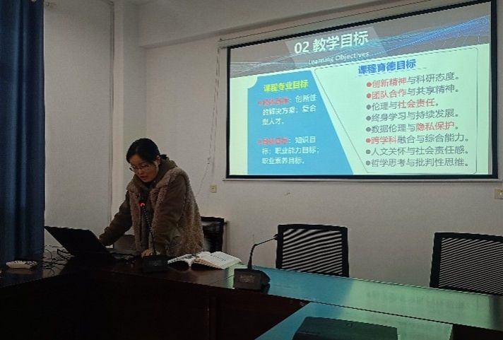 会上,四位教师结合课程特色与教学实践,围绕所授课程的思政元素挖掘、融入路径、教学案例及实施成效展开系统说课,内容详实、亮点突出。罗招贤老师聚焦《计算机应用基础》课程,分享如何将技术应用与社会责任、创新意识相结合,引导学生树立严谨务实的学习态度;李金凤老师以《人工智能导论》为切入点,阐述如何挖掘人工智能领域的科技伦理、家国情怀元素,培养学生的科技担当与人文素养;谢晓燕老师针对《Python程序设计》课程特点,讲解如何在编程实践教学中融入工匠精神、协作意识,提升学生的职业素养;程小涛老师结合《综合布线》课程实操属性,分享如何将规范操作、安全意识与敬业精神融入课堂,实现技能培养与价值引领同频共振。四位教师的分享案例鲜活、思路清晰,为参会教师提供了可借鉴的课程思政教学思路。